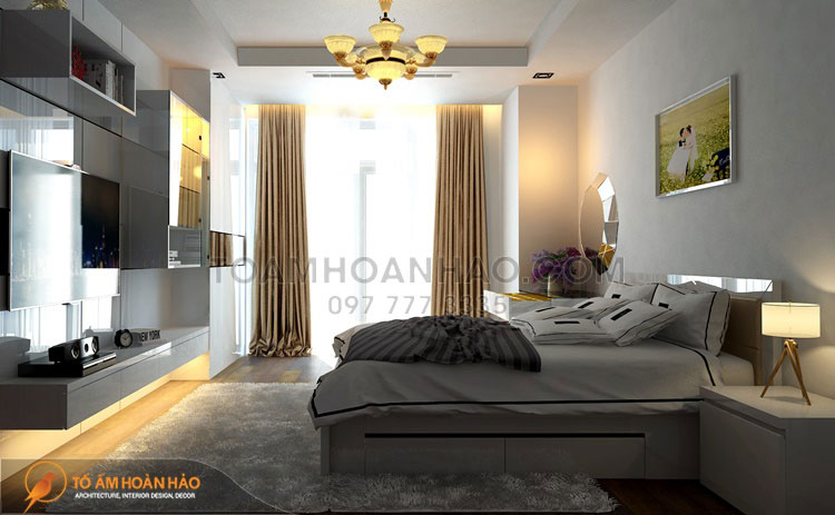 Phòng ngủ cho đôi vợ chồng trẻ được thiết kế lãng mạn nhưng không kém phần hiện đại. Đèn trần ánh sáng dịu dàng kết hợp với rèm cửa tông vàng tạo cảm giác ấm áp, thơ mộng. Phòng ngủ còn được trang bị tivi phục vụ nhu cầu giải trí. Giường được thiết kế thông minh có ngăn kéo giúp việc sắp xếp đồ đạc thêm ngăn nắp, gọn gàng.