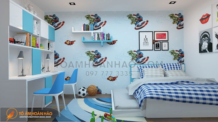 Phòng ngủ của 2 con được thiết kế sinh động, khỏe khoắn với gam màu trắng và xanh dương. Phòng ngủ của các bé còn được tích hợp thêm chức năng là phòng học. Bàn học kèm giá sách đôi được bố trí ngăn nắp, giường có ngăn kéo giúp tiết kiệm tối đa diện tích, là lựa chọn thông minh để các bé có không gian học tập, nghỉ ngơi rộng rãi, thoải mái. Căn phòng sử dụng giấy dán tường họa tiết sinh động, phù hợp sở thích, tạo sự thích thú cho các bé.