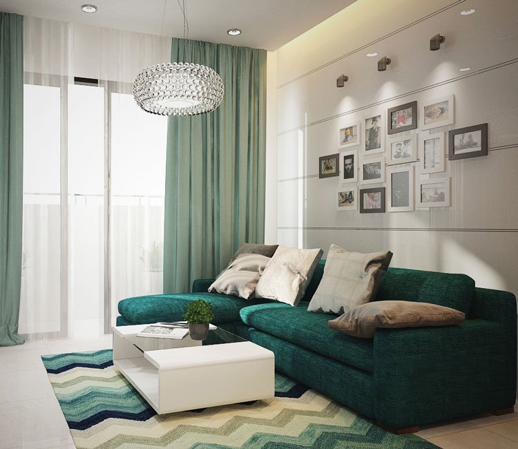 Không gian phòng khách dù khiêm tốn về diện tích nhưng nhờ có cửa sổ rộng rãi kết hợp với những tấm rèm mỏng cùng sự liên kết mở với phòng ăn đã trở nên thông thoáng và rộng rãi hơn. Bộ ghế sofa màu xanh bích đậm vô cùng ấn tượng trên nền sáng của căn hộ.