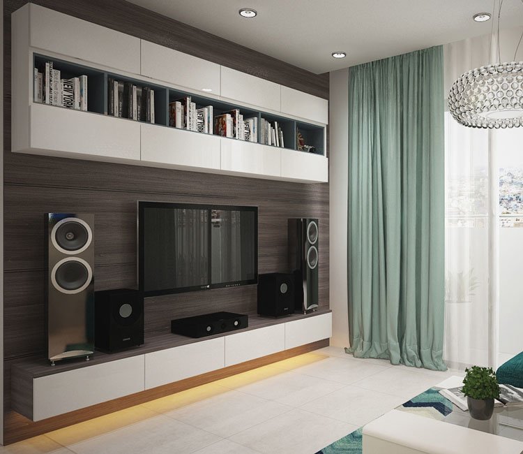 Kệ ti vi có màu gỗ trầm làm tăng vẻ hiện đại, sang trọng của căn hộ.