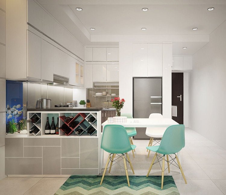 Phòng ăn và phòng bếp vừa liên kết lại vừa bị ngăn cách bởi một thiết kế đảo bếp tiện lợi và xinh xắn.
