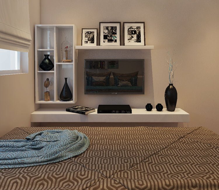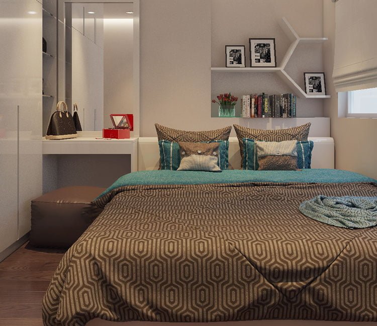 Không gian phòng ngủ ấm áp và gần gũi với chiếc giường rộng và ga trải giường màu, tạo ra những kệ nhỏ xinh gần đầu giường là một ý tưởng hay để bạn trưng bày một số vật dụng hay sắp xếp những thứ cần thiết mà sáng mai ngủ dậy bạn bắt buộc phải dùng ngay như kính hay đồng hồ.
