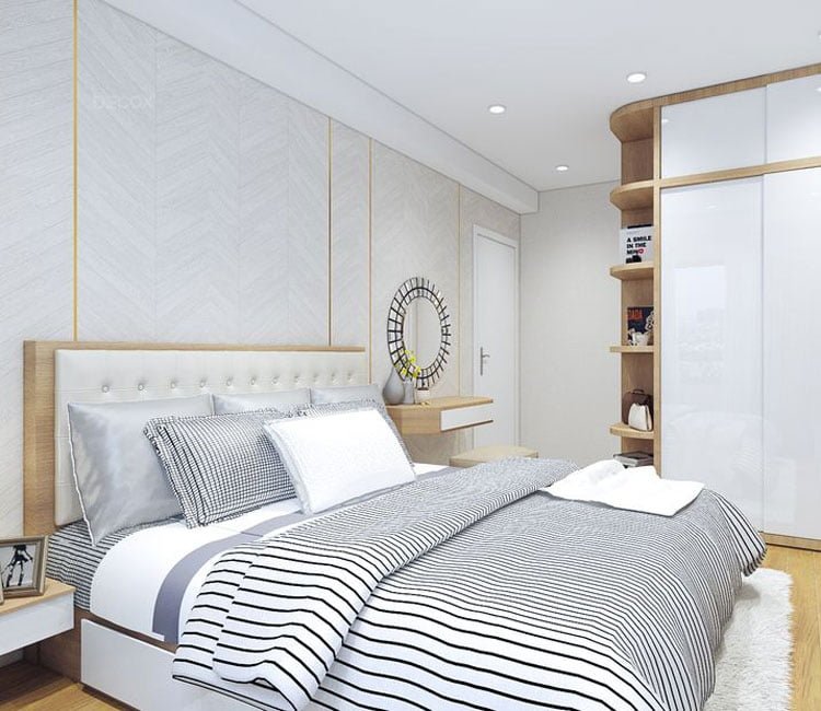 Phòng ngủ master trở nên rộng rãi hơn nhờ gam màu sáng mang lại cảm giác khoan khoái và dễ chịu. Kết hợp với đó là họa tiết sọc đến từ nội thất tạo cho gia chủ một không gian sống ngọt ngào và ấm áp cho không gian riêng tư. Giường ngủ và bàn trang điểm được bài trí khoa học nhằm mang đến một cuộc sống đủ đầy và đảm bảo sự thuận tiện khi hoạt động. Cách phối hợp gam màu nhẹ nhàng tạo cho gia chủ căn phòng ngủ ấm áp, không còn cảm giác khó chịu khi trở về sau một ngày làm việc vất vả.